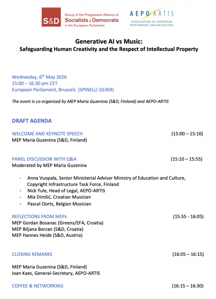 AEPO-ARTIS is pleased to invite you to a full-day conference titled “7 Years On… Assessing the Copyright in the Digital Single Market Directive”, taking place on Tuesday, 5 May 2026...